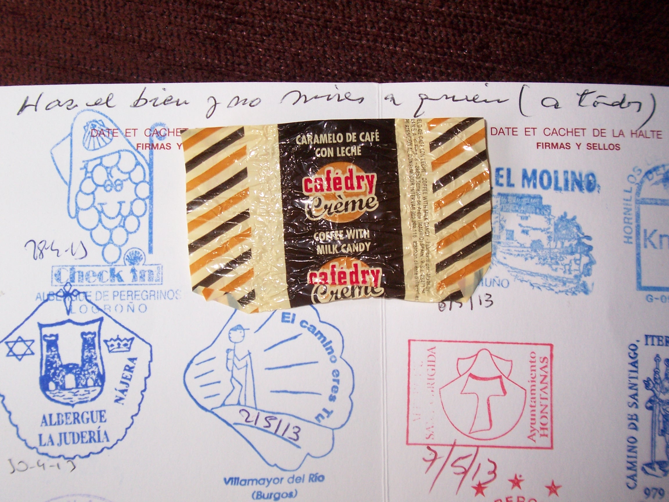 - Pepe’s inscription on my pilgrim passport and the wrapper from the candy he gave me ❤